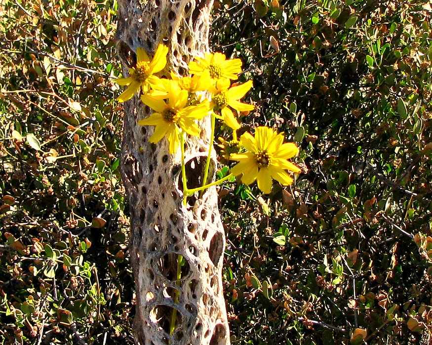 A Cholla Skeleton makes a good vase for these yellow flowers.