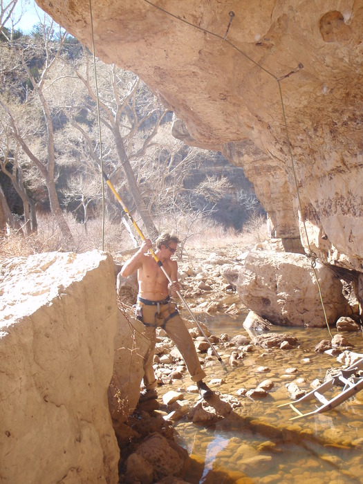 Mike setting up a MacGyver style belay for Hall of Flame, 13b... and pretending to spear fish for my photo!
