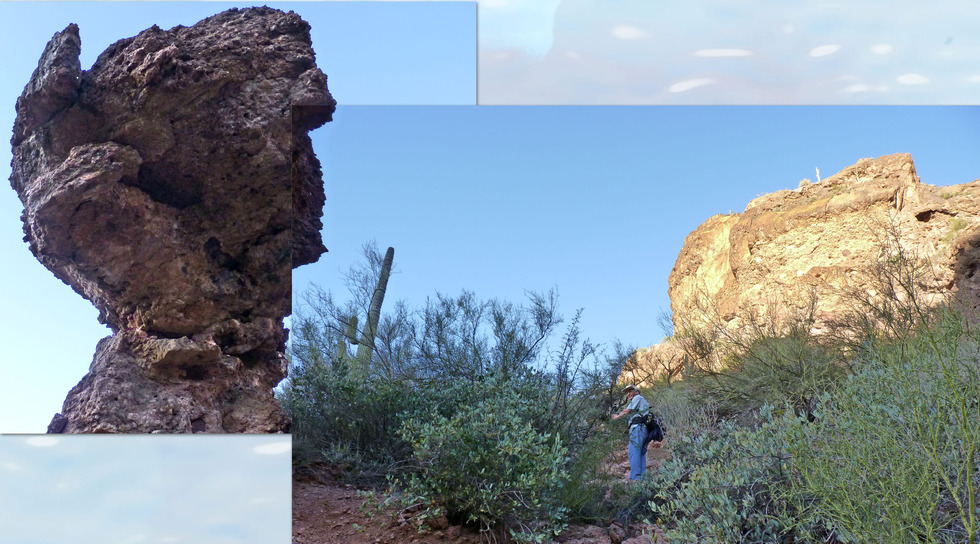 I think I could make this stitching a lot better but you get the point. This is a combined photo of that big boulder sitting on a pillar of rock as you head up, and up. John is on the trail to the right of it a little higher up.