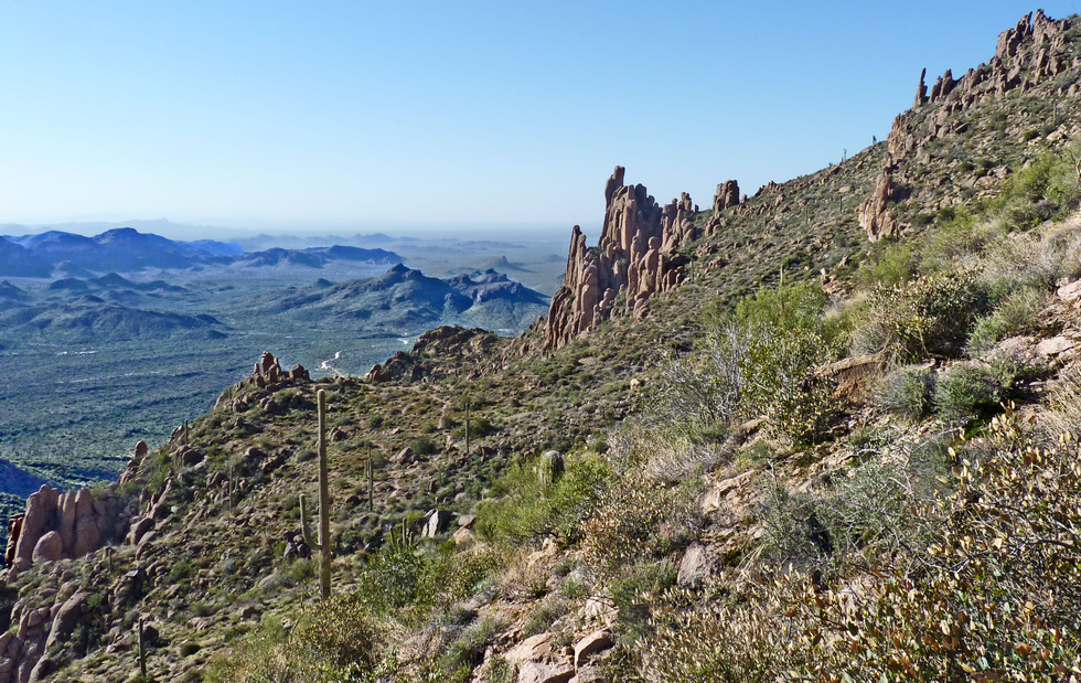 The reason I posted this photo is I thot it was neat how the road looks like it goes right into the trail at the saddle (where we just were) below. You can also see that rock formation that kept drawing my eye (it looks like a finger now) in the upper right.