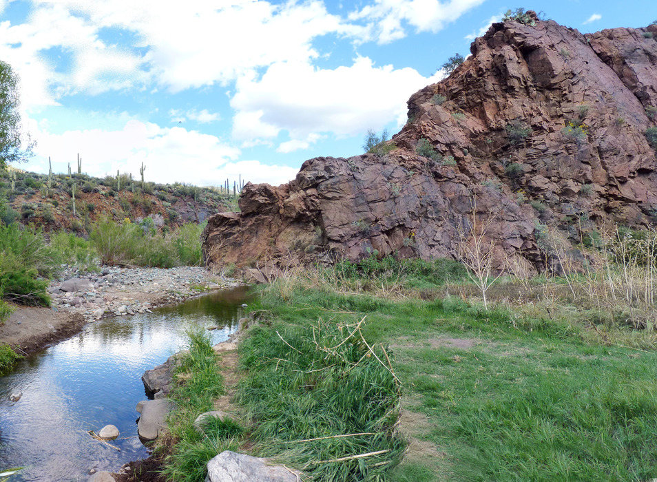 Ok, I don't know who teased me about my first stiching try on the Robber's Roost hike but take a look at this stitch. I think it turned out pretty good. Anyway, this is a new creek crossing since I was out here in Oct 2009. See my trip description. When the creek re-routed itself, it created this beautiful pool of water. This just used to be a sandy section to the left and you walk around the rock and head up the hill and up the trail. Now you have to cross the creek and then cross it again before you can head up the trail.