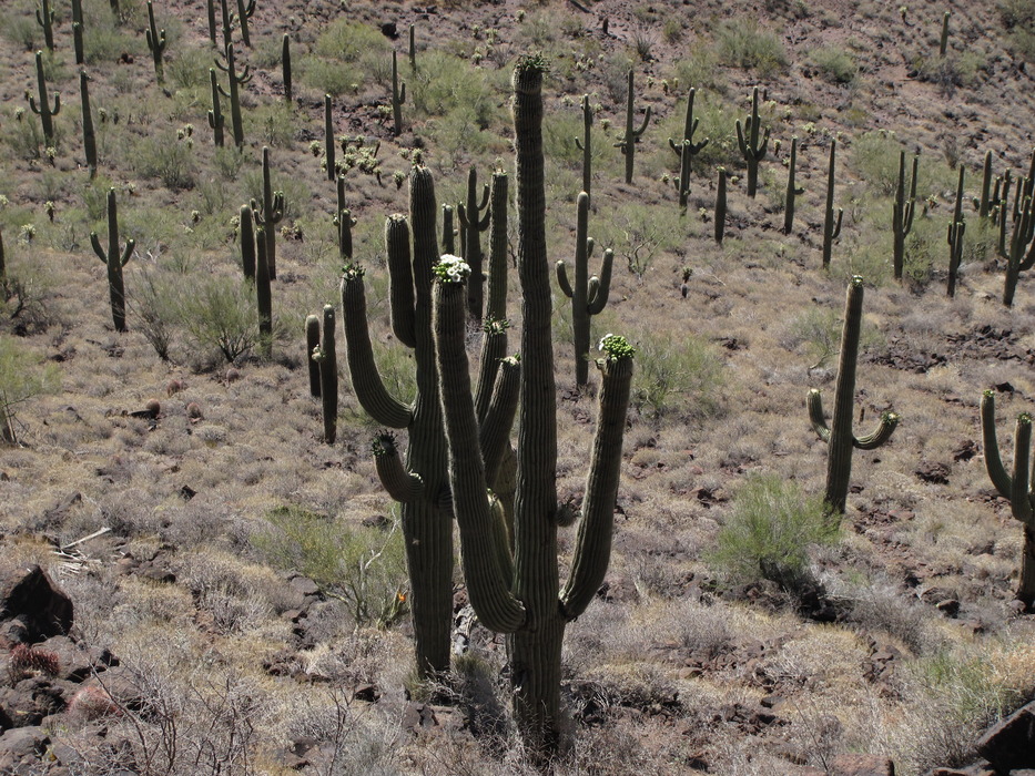 On the way down I encountered a saguaro holding 2 bouquets of flowers.