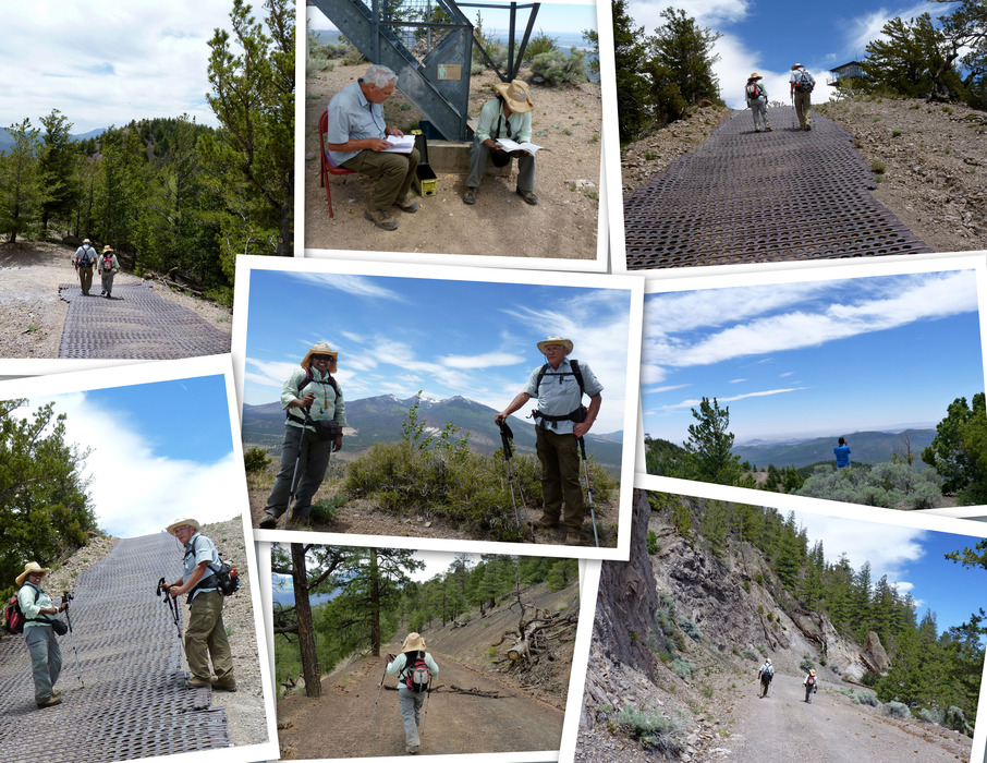 Yes, it was a good day on the trail. Here you can see the grating on the road up to the Tower. The middle photo is at O'Leary Summit Peak as is the photo of Guru in the left middle photo where he is photographing the Sunset Crater area. The middle bottom we encountered a fallen limb that wasn't there on our way up. The lower right photo is John and Ambika heading down the road-trail. The upper middle is John and Ambika checking out the books at the bottom of the tower.