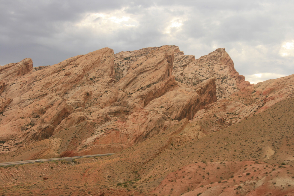 The interstate alignment through the swell is the longest stretch of interstate in the US with no motorist services (110mi), and is considered one of the engineering marvels of it's time. When workers arrived to begin construction of the 5 lane roadway through this narrow slot canyon, they could touch both canyon walls with a stretch of their arms...