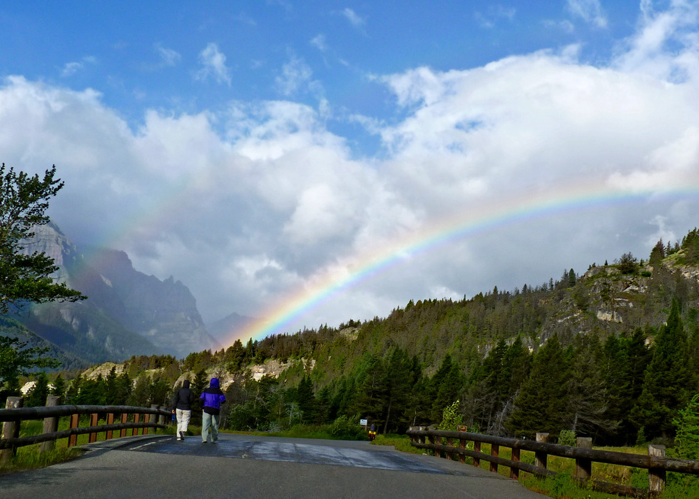 that I got up this morning knowing we would be leaving the Park today. Oh and it was WINDY! I stayed in the actual motel section of the Rising Sun (after adjusting my reservation due to having to check out and back in due to our stay at the Granite Park Chalet) so I was up on the hill with a view and apparently the wind was coming up to check it out.As I was driving over to the Campground, I encountered a beautiful rainbow; check that, a double rainbow