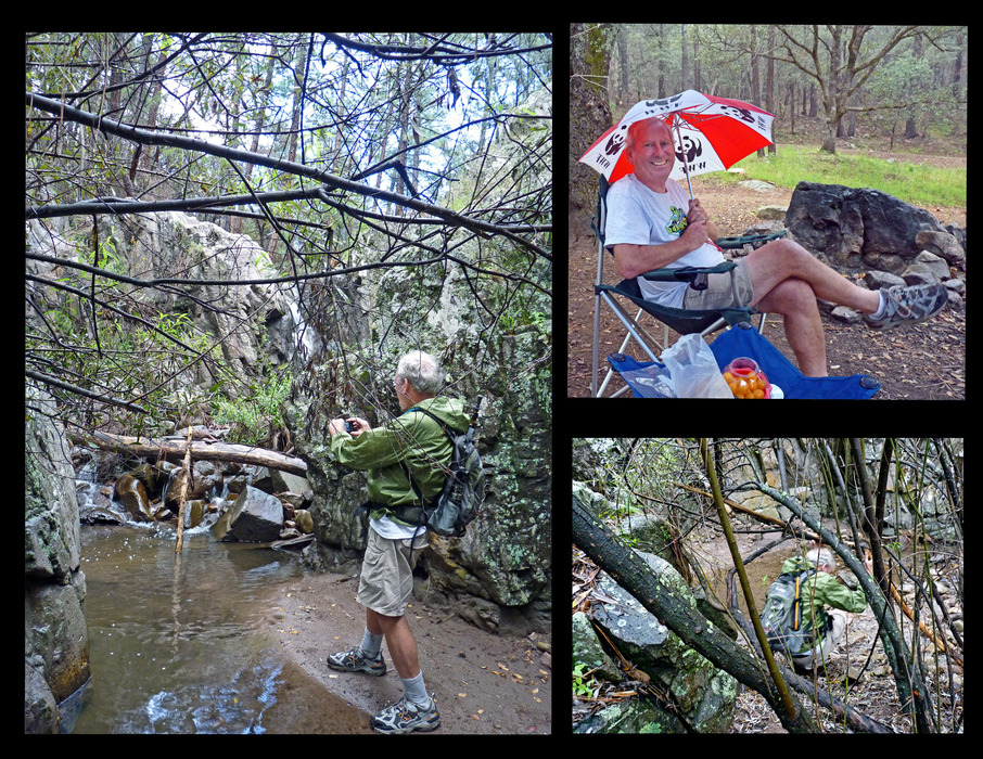 Randy taking a photo of the obstruction we encountered trying to get to the waterfall. Randy at camp with his cutesy umbrella. LR Randy getting under some of the obstruction to only find another obstruction (left photo).