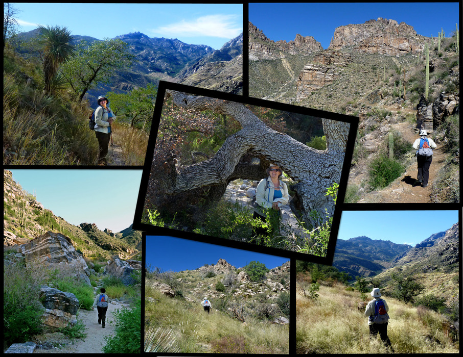 My favorite is the upper left. In the middle, this is the second hike where there had been a Wendy-height tree. The lower right is Wendy on the trail looking toward Cathedral Rock area. The lower left is Wendy as we make our way at the beginning of Bear Canyon.
