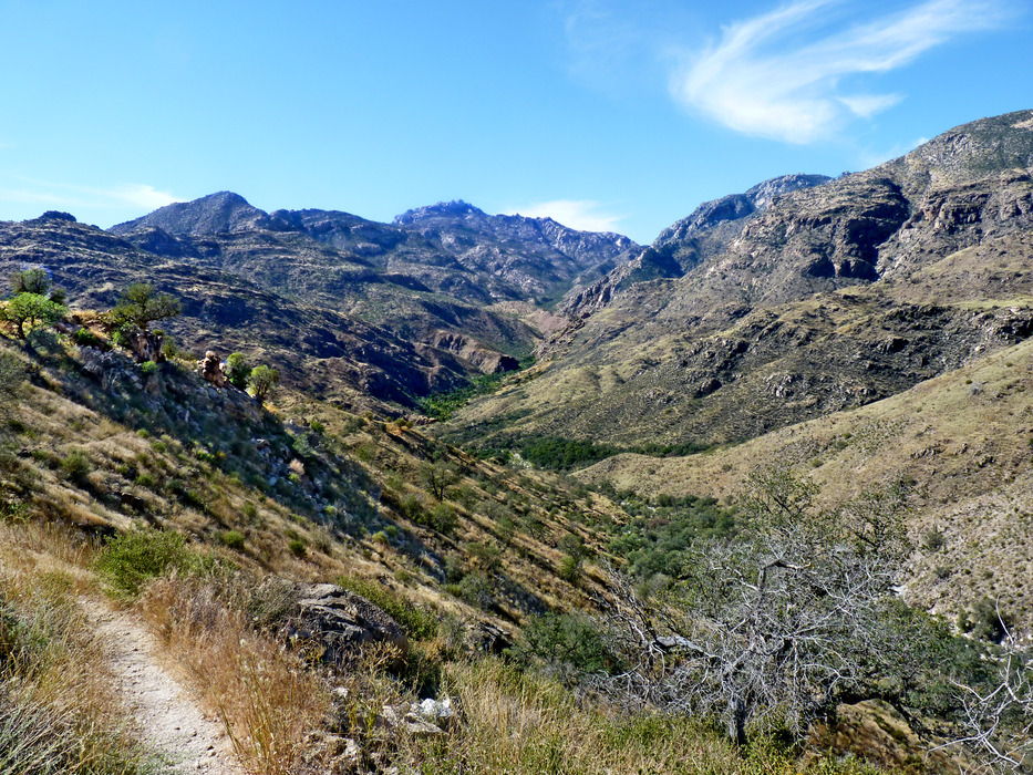 Looking toward the east side of the Romero area with Cathedral Rock ahead (with Rattlesnake Peak? to your left. We are now on the one of the Fork Trails (I think it is the East Fork until you get to the intersection with Box Camp Canyon) in the Sabino Basin area.