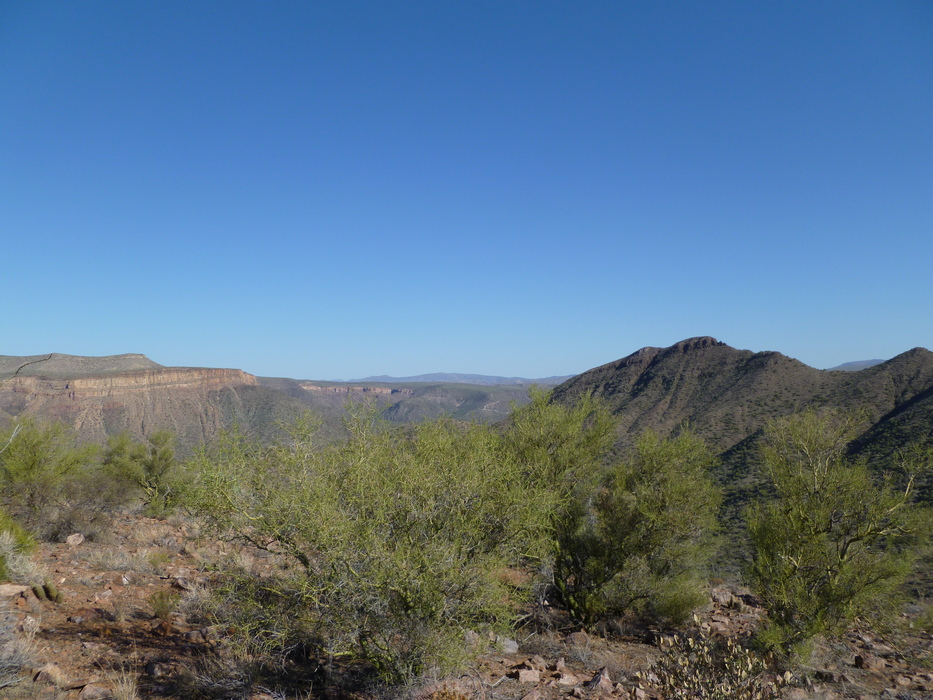 From the top of Little Flat Top Mountain: The eastern edge of the Brandenburg Mountain escarpment and the very rugged Periz Peak -- just to the left of which you can see a bit of Whitaker Ranch Road, which is where you would go if you drove left through the fence at the trailhead.