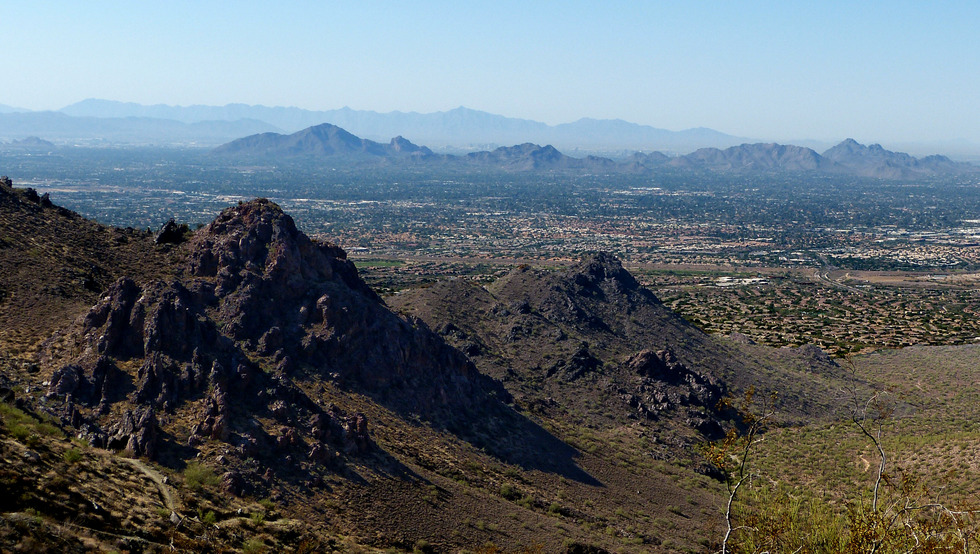Zooming west before leaving the Pass. You can see part of the trail in the lower left. This photo gives you a good sense of the layout of the Valley with the mountains running thru Phx, South Mountains and then the Estrellas.