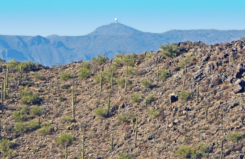 ZOOM: Dwarfed by the adjacent air traffic radar dome, Humboldt Mountain Lookout was built by the FAA to Forest Service specifications in 1958. The CL-100 R-6 metal flattop cab with catwalk on a 30 steel tower replaced a 1940 L-4 on a stone foundation. The Tonto National Forest station is in active service.