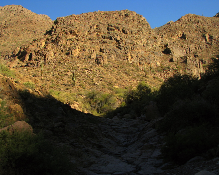 Looking up the sun-drenched Western wall of the canyon, with it's population of Saguaro.