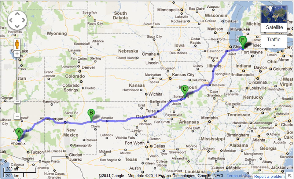 Phoenix AZ to South Bend IN via Tucumcari NM and Marshfield MO...