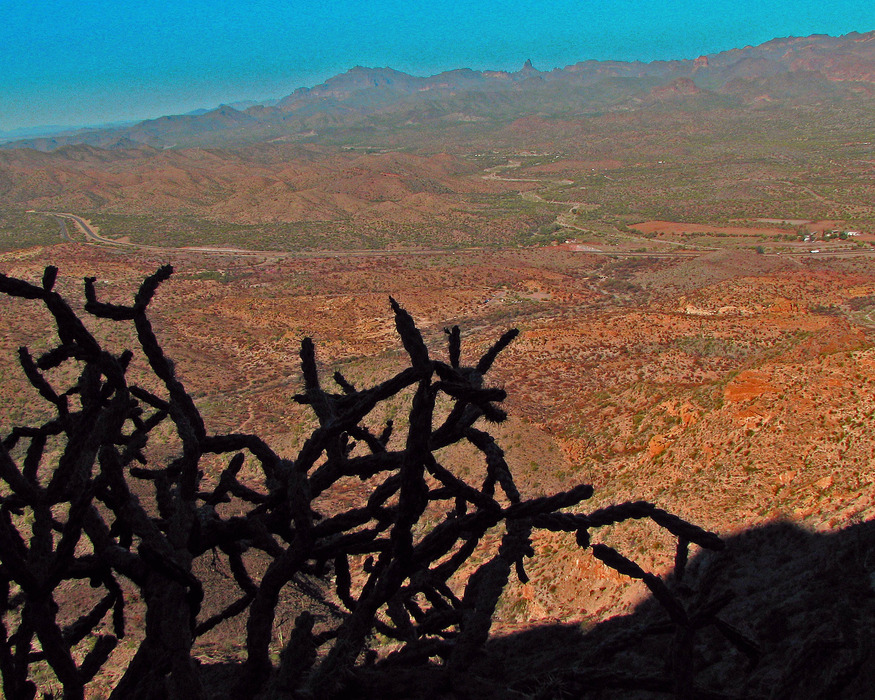 Hwy 60 disappears off to the upper left while Queen Creek winds through the center and always a view of Weavers Needle.