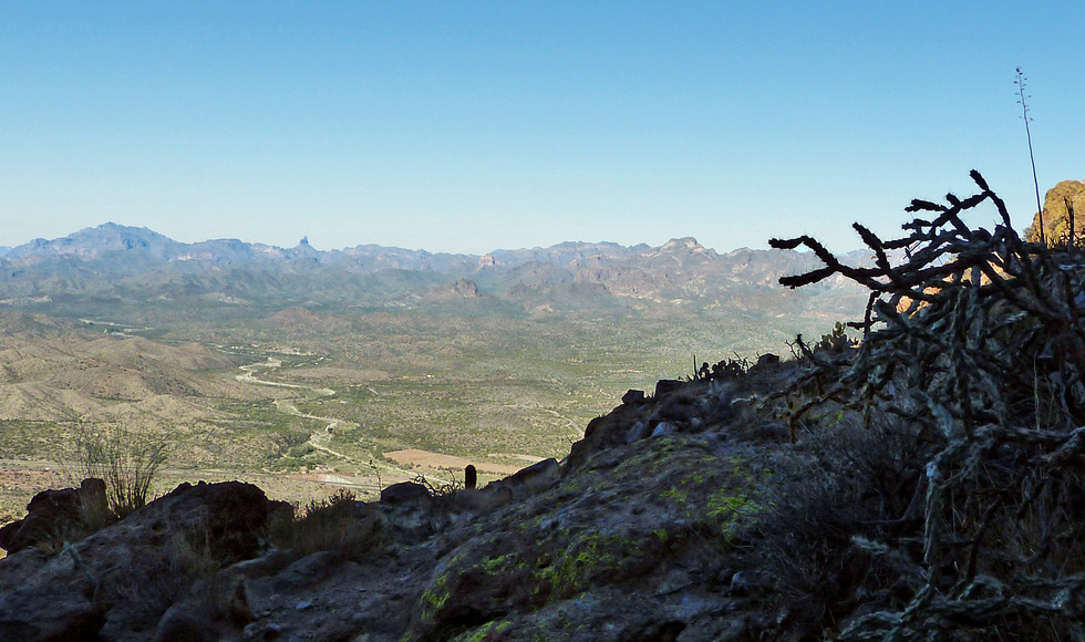 A nice view into the valley of Queen Creek with many of the landmarks of the Superstitions in the background.