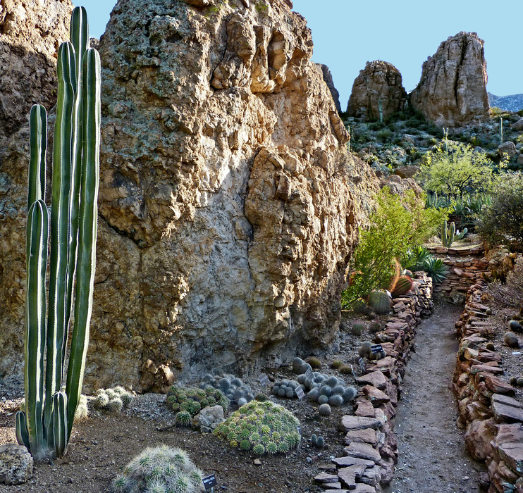 I am very fond of the Mexican Fencepost Cactus. There are other of these cactus in the garden too. These seem a bit out of place with the smaller cactus below but when it fills in, it might look pretty cool. I seem to recall that this bed was full of cactus so I'm not sure if they cleaned it to change it or if something else happened. Anyway, I like these raised beds with the walkway between them.