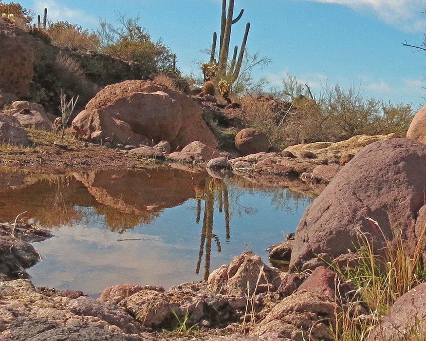 A small reflecting pond captures the image of a Saguaro and the Arizona sky.