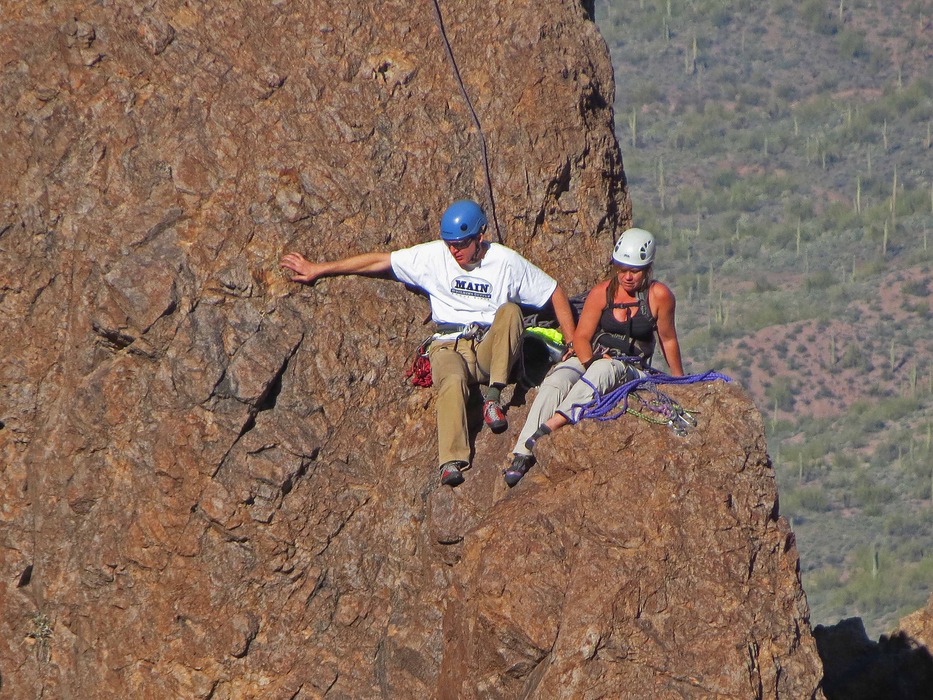 Two climbers on the first step, while the lead climber has reached the second step and another is climbing.