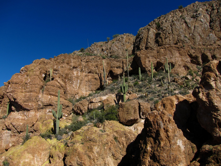 Saguaro bench on the high alcove saddle (alove caves on background cliff edge).