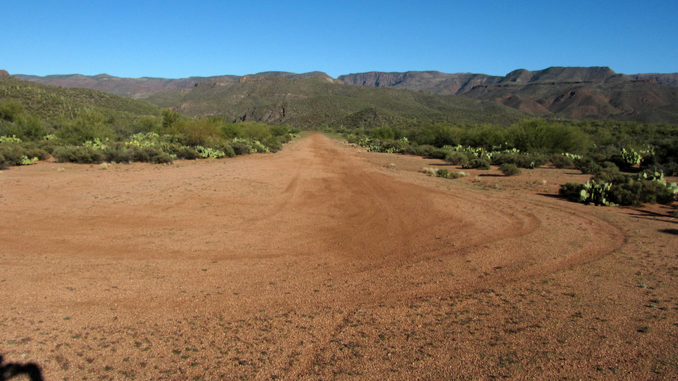The runway of Red Creek International Airport looking towards the Mazatzal Mountains.