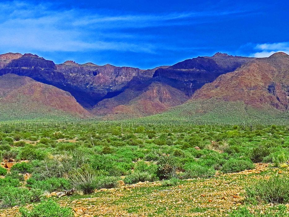 The Southern exposure of the Superstitions with Hog Canyon on the right and unnamed canyon on the left. Note the alcove high above the unnamed canyon.