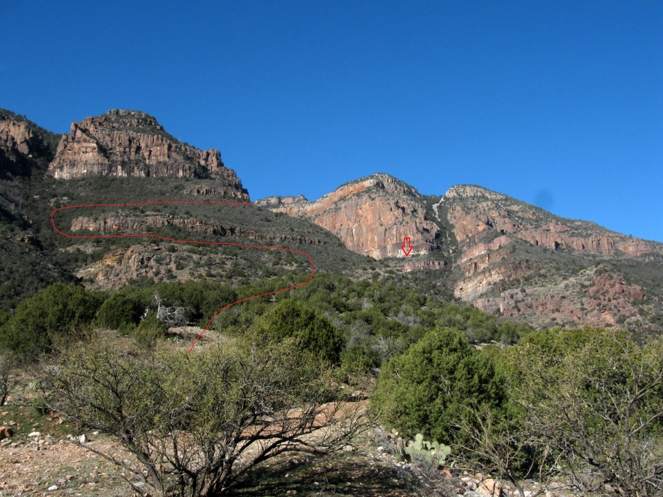 View of the mouth of Pueblo Canyon from Pottery Point. The approximate path of the trail and old mining road up to the ledge on the south side of the canyon is shown by the red line. The red arrow shows the location of the outermost ruin on the north side of the canyon.