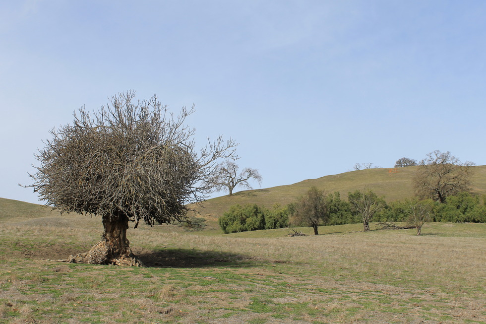 Weird looking dead tree. I think it's an olive tree. It's easy to see the damage that extensive grazing has done to the area.