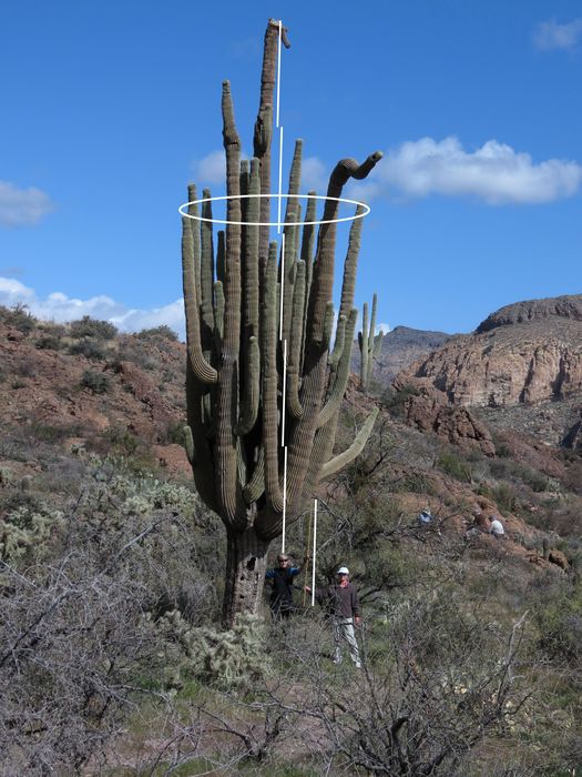 A 6 ft folding carpenter's rule comes out of the pack and serves to gauge the height (the rule is the yellow stick being held by my two hiking partners). There are 5 such equivalent rulers from the top of Suzanne's head to the top of the cactus. So with her 5 ft 8 in height, the cactus is 35 ft 8 in tall. We would have guessed a taller height. The crown had a diameter of 10 ft 10 in, giving a circumference of 34 ft 2 in.
