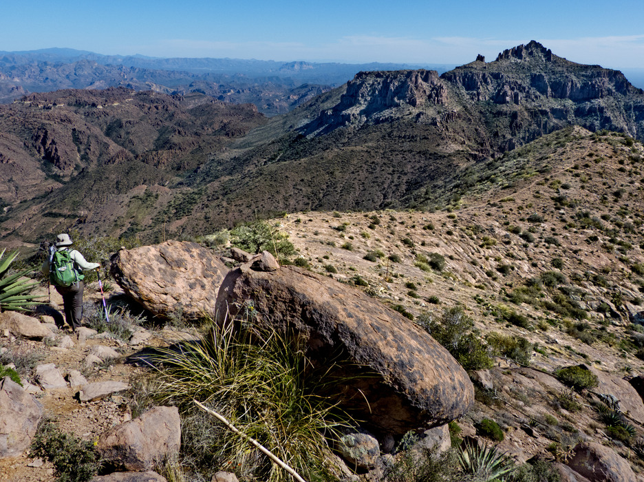 Wendy making her way toward that nice stretch of trail ahead. There are also a couple pinion trees we would pass in this little stretch. I loved the stretches of "hike and gawk" trail. And if you're wondering... where the trail ends you go down a slightly steep hill over to the ridge where you will eventually go to the right and up the hill to the chute below Peak 5057 summit trail.