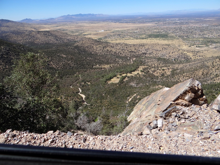 view down to lower Carr Canyon, Sierra Vista, and the Whetstone Mountains in distance