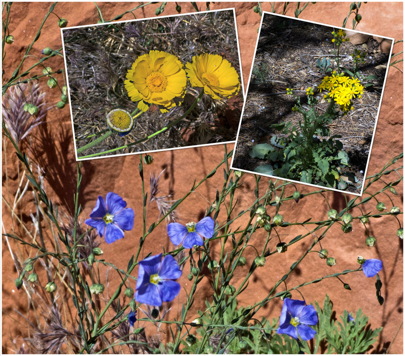 Most of the flora on this hike was near the parking lot. Here we have some flax (background) and right photo: senecio (had quite a base of leaves). I'm not sure what the yellow flower that looks like a desert marigold is.