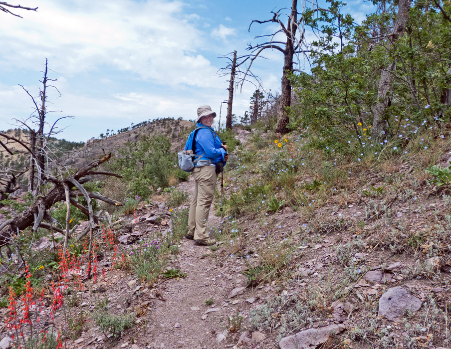 Wendy between the penstemon and flax. Her shirt blended nicely with the flax on the right (see next photo).