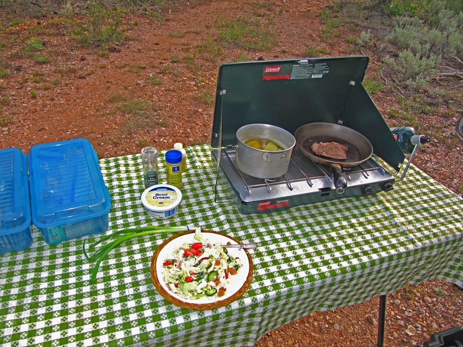At the beginning of the week I visited Camp Grasshopper on the Mogollon Rim where I was lucky enough to be invited for a couple of his great camp cooking creations. Thus the motivation for this meal. Fresh salad with cabbage, tomatoes, cucumbers, carrots and onion. Yukon gold potatoes with sour cream and green onions, and fried rib eye steak.