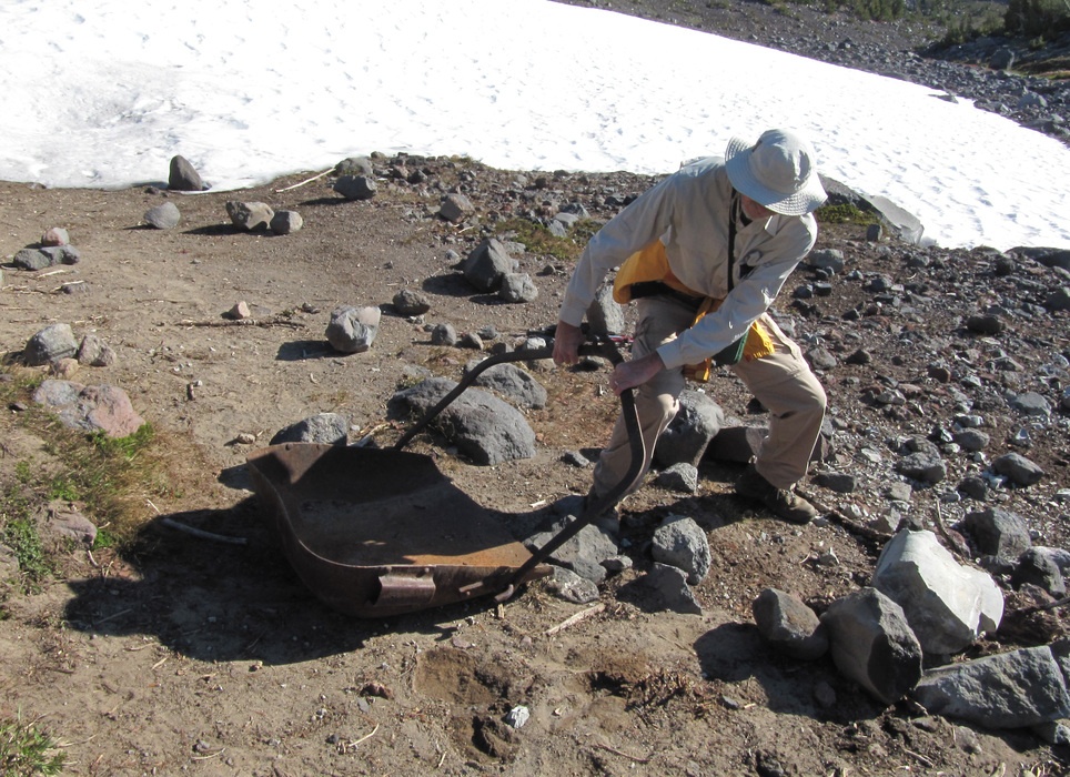 We found this old horse drawn slip scoop abandoned at Camp Lake. This implement originally had two long wood handles extending out the back which were used by the driver to control the angle of the scoop and to dump it as it was pulled by a horse or mule. This implement dates back to the late 1800s or early 1900s. Tom and I pondered over what it had been used for in this wilderness setting so long ago.