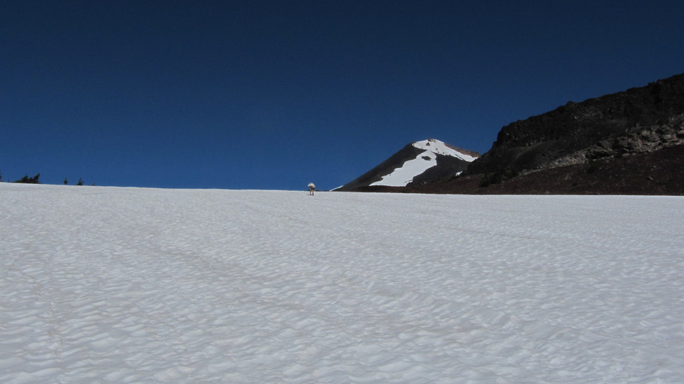 Tom leading the way up the slope of one of the many large snow fields. We were on our way to climb the Middle Sister seen in the back ground. We only made it to 8000 ft where I ran out of energy and guts - the climb up a steep razor back ridge looked to scary for me.