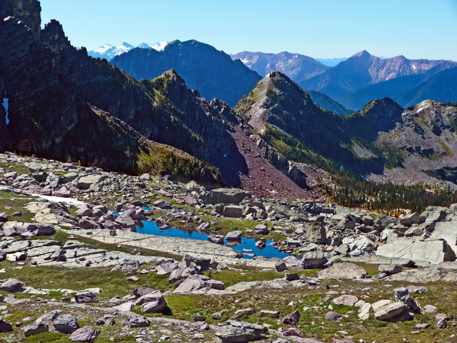 Rising up to the next tier. This is looking back toward Lincoln Pass where we had come from yesterday. You can barely see the trail that takes you to the Chalet. In the background is the Lewis Range and beyond that I think might be the Flathead Range. Behind the Flathead Range I believe is Hungry Horse Reservoir where we would visit in a few days.