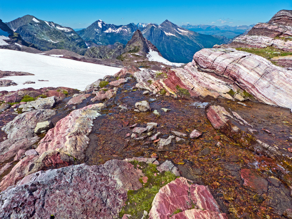 This creek has no name but I am going to call it Little Matterhorn as it flows all the way to this side of the Little Matterhorn Mtn and then falls all the way to Avalanche Lake. This view is looking NW. Another colorful view! I think the mountains behind the Matterhorn are LtoR: Vaught, Stanton, Heavens Peak. To the left and closest to Matterhorn is Brown.