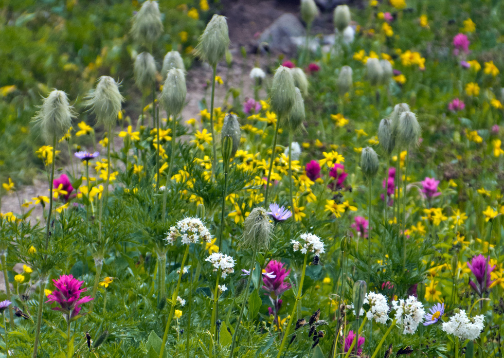 This photo features our ITs or Pasque Flowers after they've bloomed. (seed heads) This is what it looks like when in bloom: http://hikearizona.com/photo.php?ZIP=214900 I do wish I knew what the yellow flora was. You can also see the prominent Rosy Paintbrush and the white Sitka Valerian.