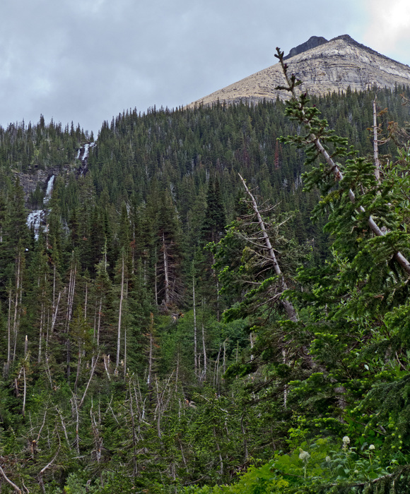 I've zoomed back out to give you the whole picture from just near the avalanche area. You can see the falls on the left and Mt Siyeh on the right. Also, notice the leaning trees on the right. I presume some sort of residual effect from the avalanche.