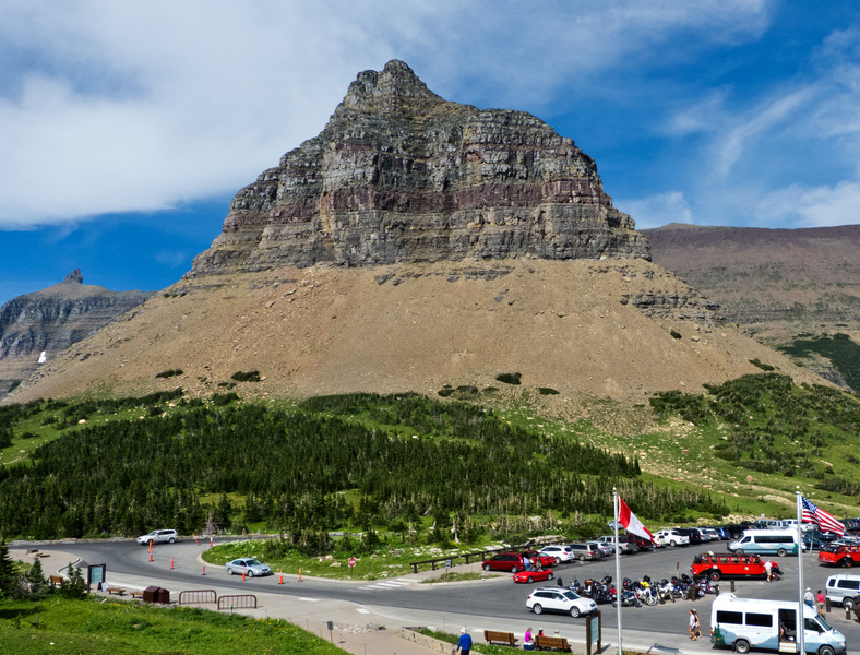 An overview of some of the parking area at Logan Pass with Pollack Mtn. To the left of Pollack is Bishops Cap and to the right is Piegan Mtn. A lot more snow was present last year: