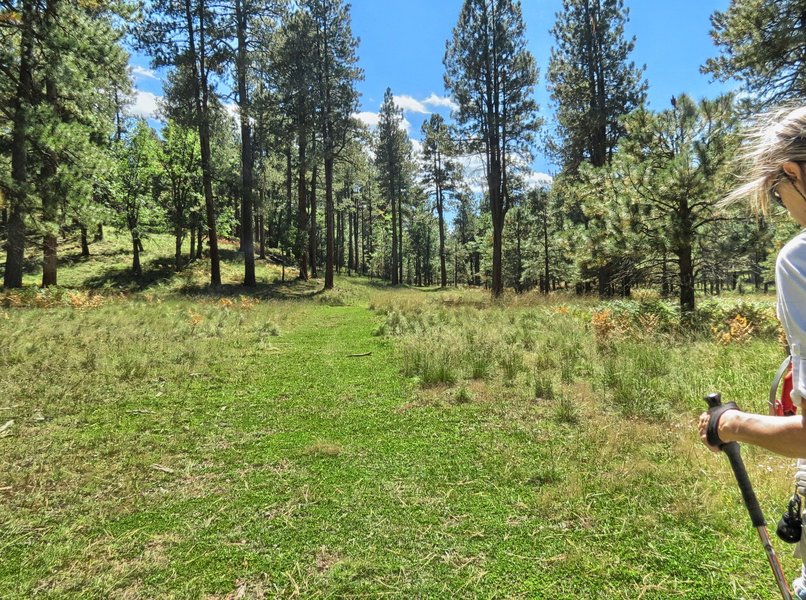 Suddenly we reach the head of Moonshine Draw and we hit an old roadbed. From here it is easy hiking to the parking lot. Moonshine Spings is just on our right, protected by a high, deer and elk-proof fence. There was something dead nearby, so we moved on to avoid the stench.