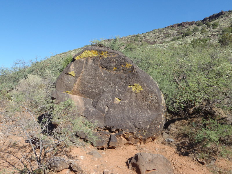 This is the petroglyphs. You have to walk about 1.5 miles from the trailhead to find this rock. It is right on the trail on your left, but you almost walk past it and look back to see it. We almost missed it. Pretty sure someone has added to the historic markings which is sad. Darn kids!