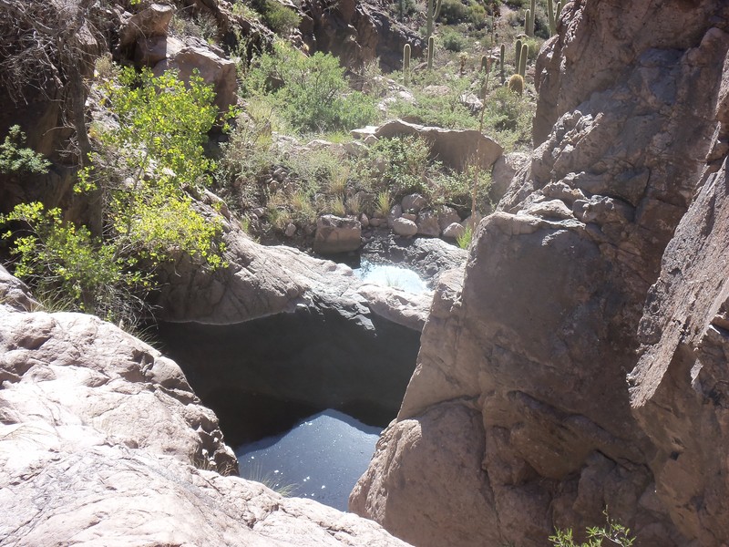 From the top of second saddle, see both ponds below waterfalls. Little water in the third level pond.