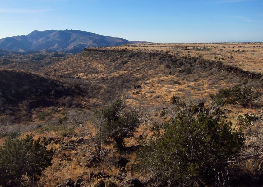 Looking south. I'll go down the creek to the left of the mesa and walk back along the rim. Main Brooklyn glyph panel along the cliff band at far right