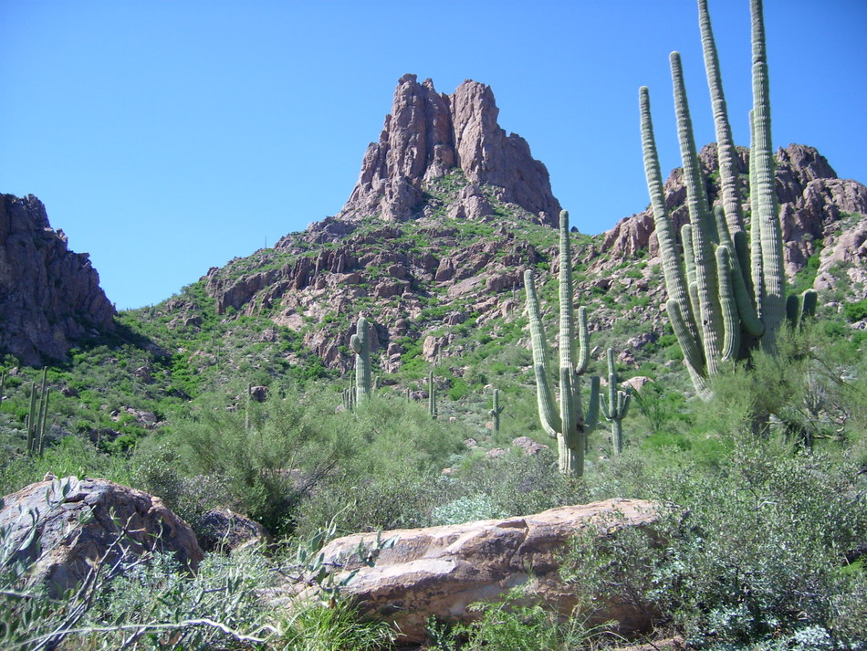 Miner's Needle. Picture taken from shade of 30' saguaro, and I'm glad it was there.