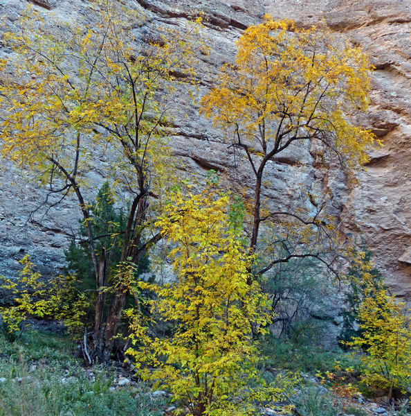 It's funny, when I was trying to weed my 400 pics or so down to this 75, I'm not sure why I chose this over the others but I did. I guess I like the golden color against the canyon wall and the green grass below. There also appears to be some sort of fir tree behind the tree on the left.