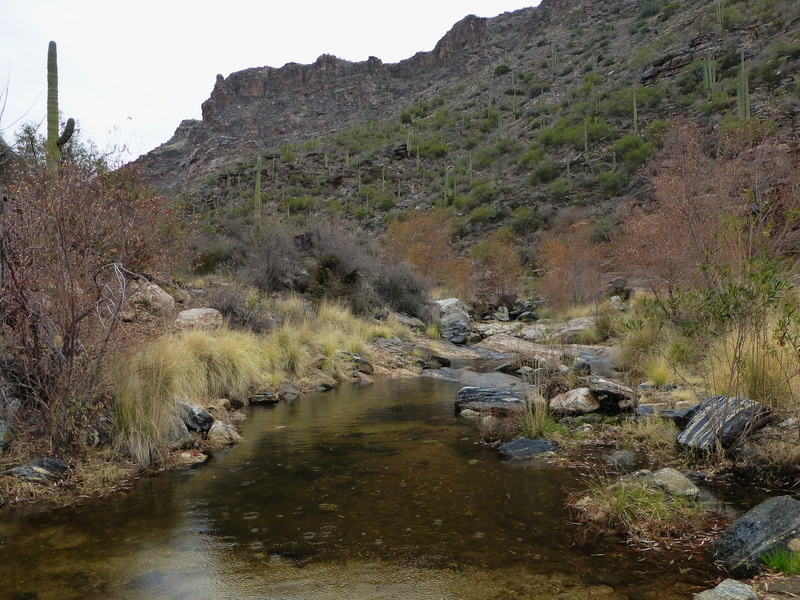 The Seven Falls Trail .... looking up the canyon. Oh, the morning weather forecast was for a cloudy day with possible rain at 10:developing late evening. Yes, those little circles in the river are from the rain ... at 10:30 or so am.:-(