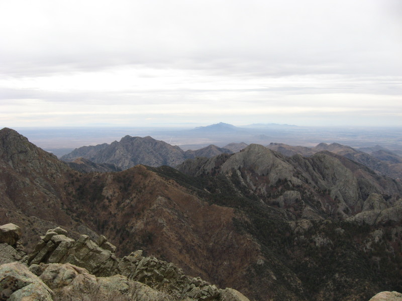 The nearer peaks are the extension of the Organ Mountains that are Rhyolite. Beyond that the rock transitions to Limestone. The San Andreas to the north, and Franklins to the south are Limestone as well. The Difference between the Monzonite "Organ" group and the southern Rhyolite Peaks is noticeable from the west. Not only in appearance of the shape of the peaks, but by color.