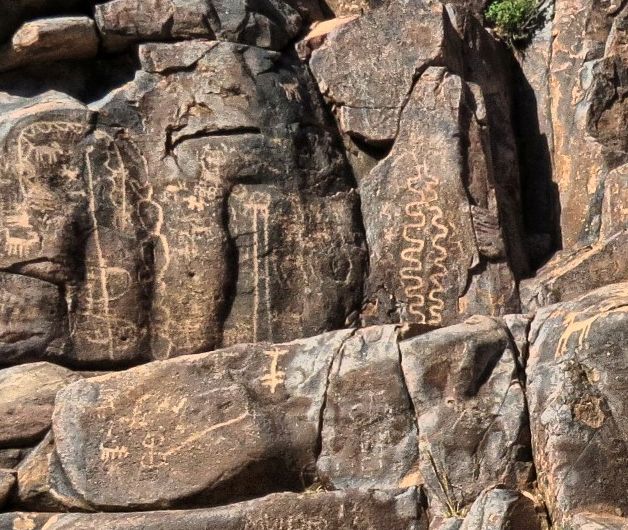 According to Patterson's book the centipede-like drawing may represent exactly that. To it's left is a tall nearly straight line that probably means corn. A closer look at the latter shows it even has some leaves on the stalk. The intertwined lines immediately to the right of the corn may "signify the root of the squash vine, the criss-crossing water gourd vine, the bean plant, or the double gourd" if I interpret Patterson correctly. On the rock below these, the vertical line with three cross arms may represent "birthing."