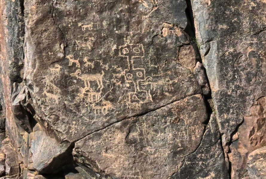 According to Alex Patterson's book, "A Field Guide to Rock Art Symbols of the Greater SW," the mult-headed robot looking figure may be the Hokokam representation for "Tlaloc, the goggle-eyed rain god of Mesoamerica." The big horn sheep representations are somewhat obvious.